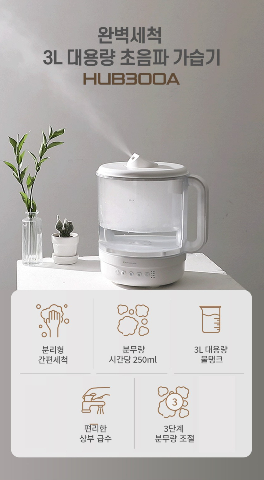 저도 아침에 일어났을 때 목이 따끔하거나 코가 막혀 있는 일이 잦았어요. 그래서 실내 습도를 유지해주는 가습기를 알아보던 중 발견한 게 바로 퓨어코치 HUB300A입니다.